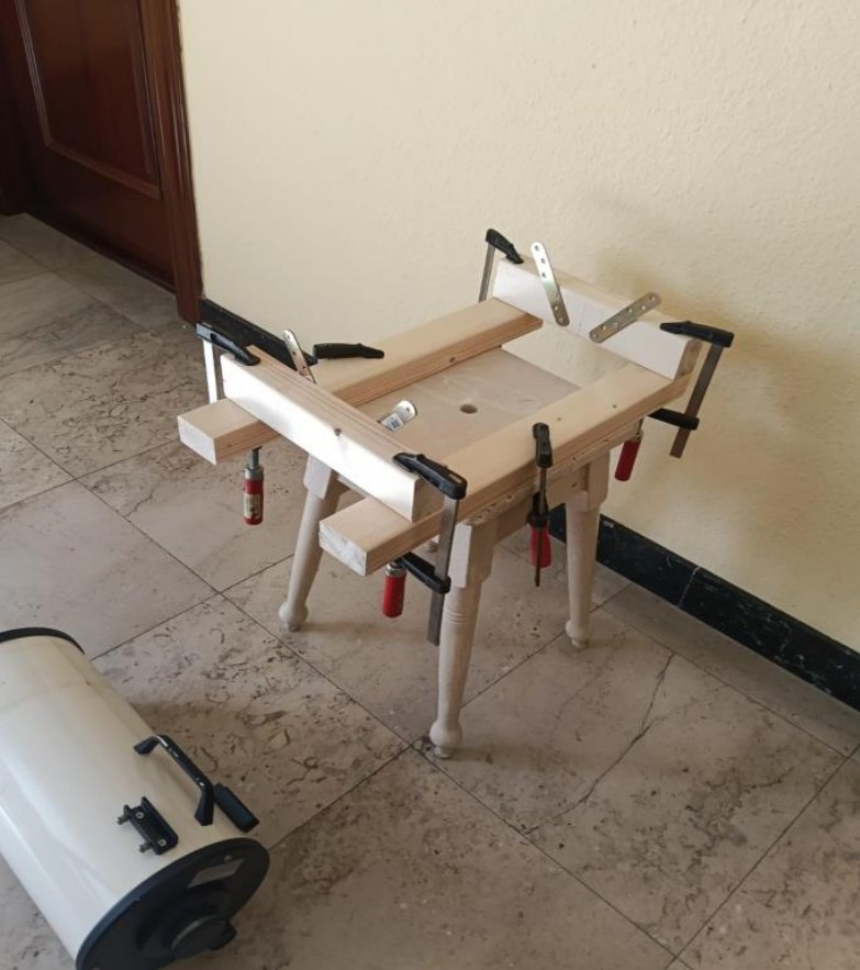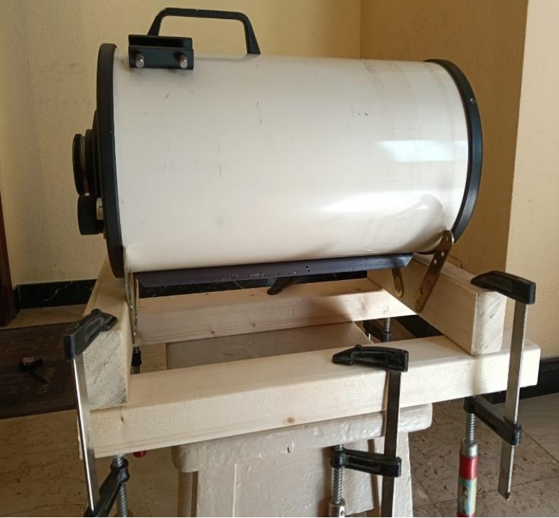 La idea, que se me ha ocurrido, consiste en conseguir que la posición del espejo primario sea los más perpendicular posible al eje mecánico del tubo del telescopio. Para ello construyo un bastidor sobre el que coloco