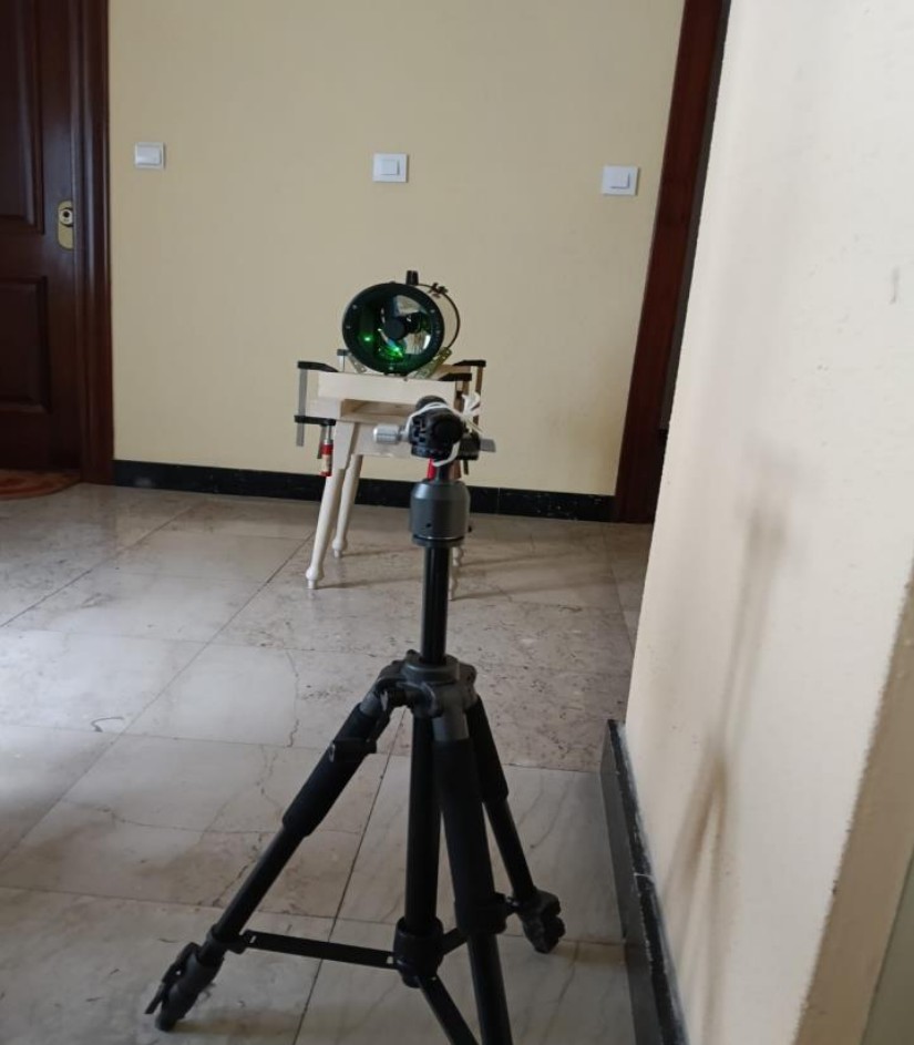 Una vez que tenemos el telescopio sobre el bastidor, procedemos a colocar un puntero laser potente (el clásico puntero laser verde empleado en astronomía) sujeto a un trípode ajustable y distante 1 metro o más del frente